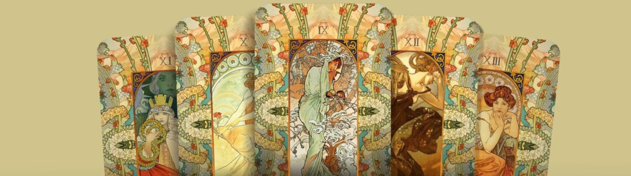 Inspirado en el movimiento artístico europeo de finales del siglo XIX y principios del XX, el tarot Art Nouveau se nutre de la obra de artistas como Alfons Mucha, que combinaban figuras humanas estilizadas, elementos naturales y ornamentos decorativos. Surge en el contexto de la expansión del tarot como herramienta de introspección y exploración estética.